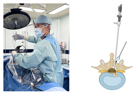 FESSとは完全内視鏡下脊椎手術(Full-Endoscopic Spine Surgery)を指し、現在の脊椎手術の中で最も低侵襲な手術方法です。1㎝弱の非常に小さな皮膚切開で手術を行うため、術後の疼痛が少なく早期回復が望めます。腰部脊柱管狭窄症や腰椎椎間板ヘルニア、頚椎椎間板ヘルニアを含む多くの脊椎変性疾患が対象となり、術翌日の退院も可能です(患者さんごとに異なります)。